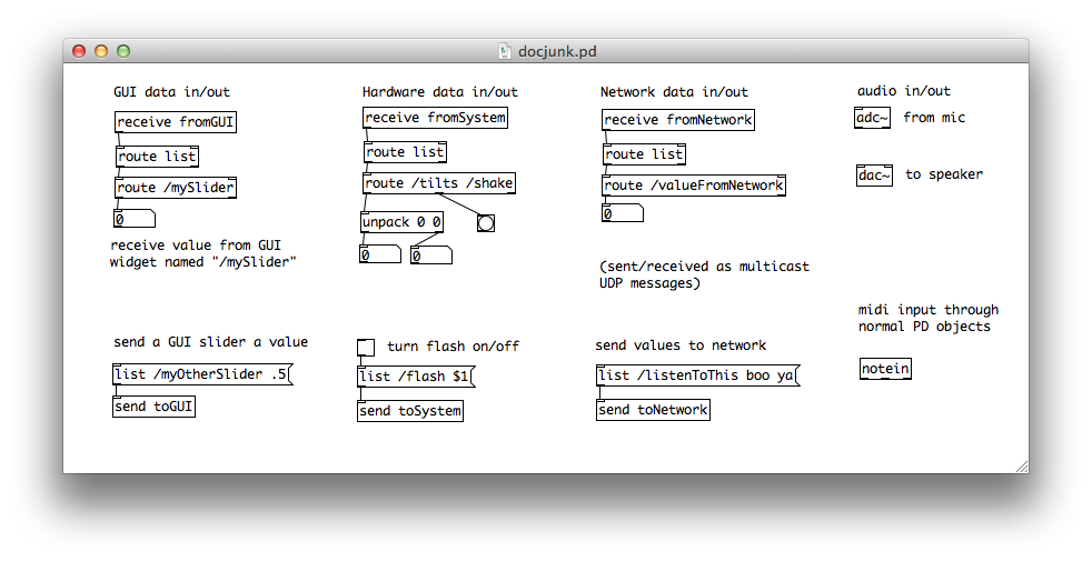 Example PureData messages: - Send a message to all clients (including back to the sender): [list /send all /myParameter myValue (