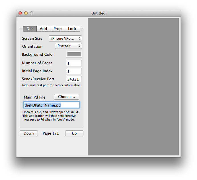 Screen Size determines the aspect ratio and size of the canvas, but this interface will still run on any device. Specify the name of the Pd file you'll be using; while this can communicate with any open Pd patch on your computer, this entry tells MobMuPlat app which pd patch to load when you open the interface on the device.